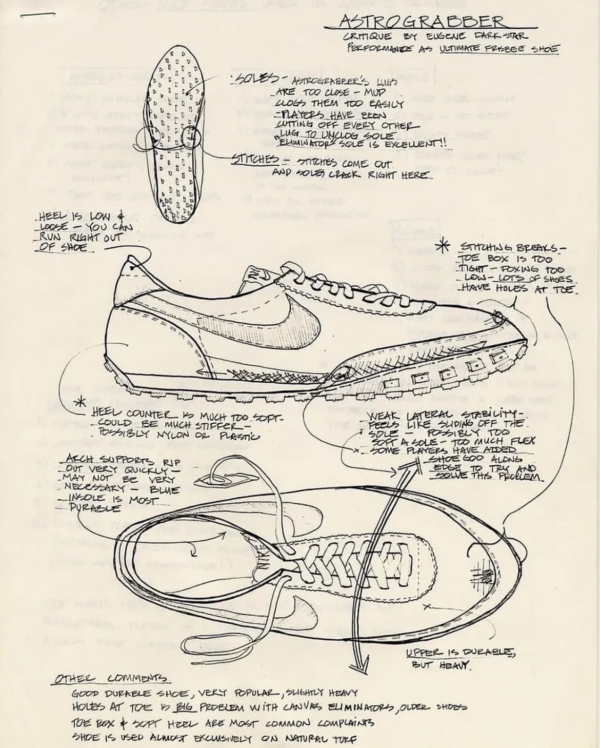 Revived with Bode Rec., the Astrograbber returns from Nike’s 1974 archives. The shoe was a purpose-built turf shoe that adapted the new waffle outsole for AstroTurf—an early icon of Nike’s innovation era. We transformed the original Astrograbber sketch into a moving blueprint.